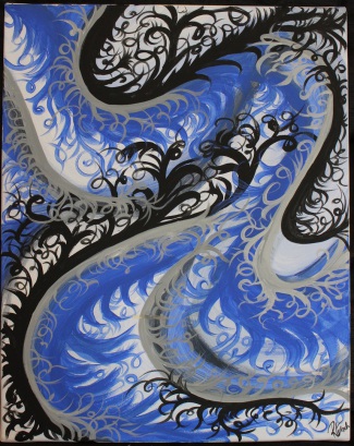 Ich erinnere mich noch sehr gut an dieses erste Bild: Als ich die blauen und grauen geschwungenen Linien gemalt hatte, fehlte mir etwas - der Kontrast. Ich getraute mich am Anfang gar nicht, die Farbe Schwarz zu nehmen. Doch für mich war es dann einfach perfekt.